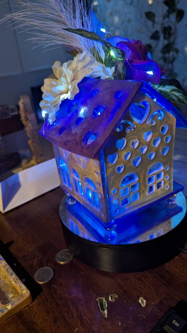 This product is Hand Made, Customized Glitter House with Lighted Silk Floral Arrangement. Light has 3 settings. Assorted Color and Scents.